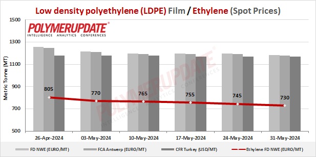 An industry source in Europe informed a Polymerupdate team member, “Trading momentum in the European LDPE spot market was consistently sluggish with most of the market participants anticipating a price change in June. Buyers have been deferring purchases of LDPE grades, expecting prices to trend on the lower side in June. The price fall is likely to be triggered by an anticipated decrease in feedstock ethylene rates, which have been under constant pressure owing to a decline in average naphtha cost throughout May. Meanwhile, the overall demand for LDPE grades has been subdued, in spite of limited material availability.”