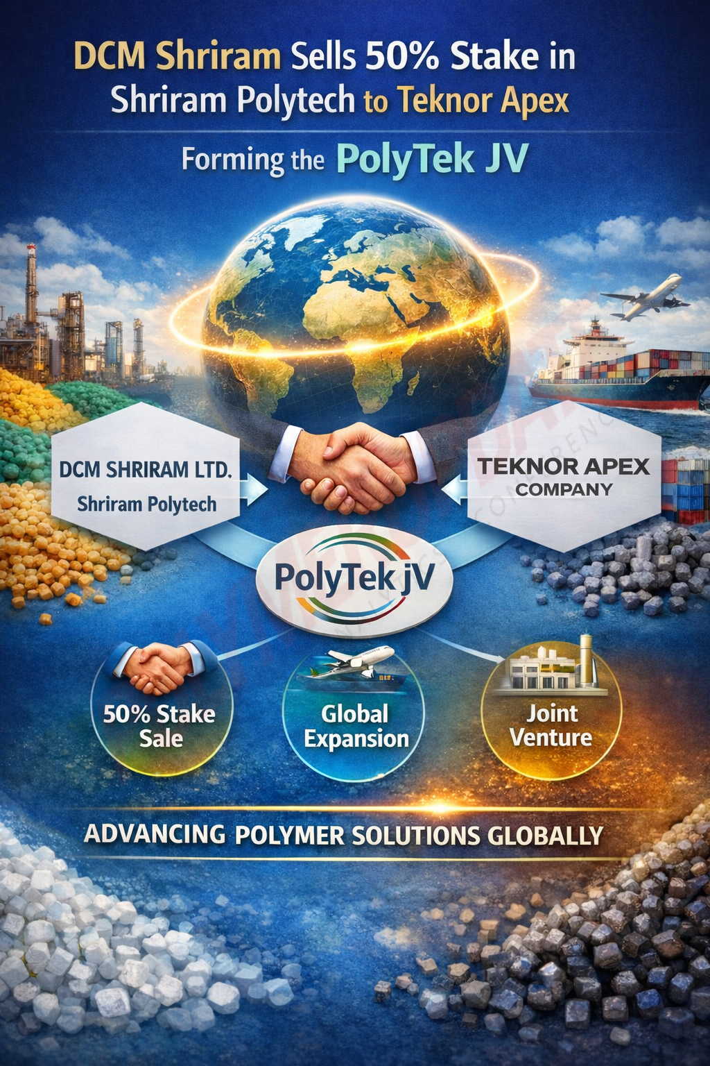 DCM Shriram Ltd., a leading multi-faceted business conglomerate, has announced the sale of a 50 percent stake in its plastic compounding subsidiary, Shriram Polytech Ltd., to the Dutch firm Teknor Apex Company for a total consideration of US$ 5.6 million. Under the agreement, Shriram Polytech Ltd. has entered into a joint venture with Teknor Apex B.V., a subsidiary of Teknor Apex Company, a global leader in plastic material science solutions. The joint venture will operate under the brand name PolyTek.