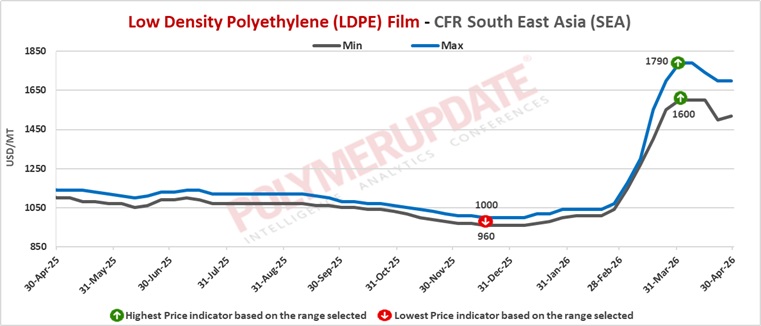 In Southeast Asia, LDPE Film grade prices were assessed at USD 1520-1700/mt CFR levels, higher by USD (+20/NC/mt) from last week.