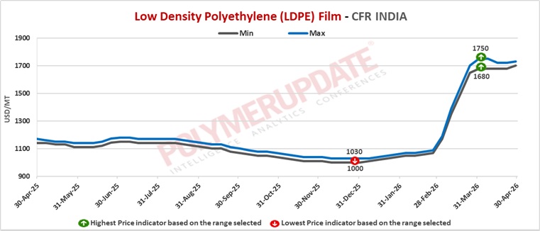 In India, LDPE Film grade prices were assessed at USD 1700-1730/mt CFR levels, a week-on-week hike of USD (+20/+10/mt).