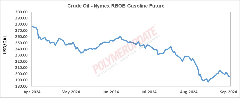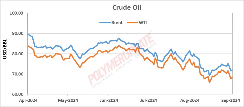 Data compiled by Polymerupdate Research showed that the benchmark Brent crude futures for near-month delivery on the InterContinental Exchange (ICE) declined by 3.25 percent, or US$ 2.51 a barrel, last week, reflecting weak global demand sentiment, led by China. Brent futures started the week at US$ 74.49 a barrel at the close of previous Friday and declined to US$ 73.90 a barrel on Monday.