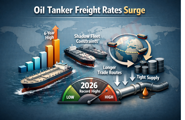 Oil tanker rates in early 2026 have surged to six-year highs, with Very Large Crude Carrier (VLCC) earnings exceeding $170,000 per day in February 2026. The rally has been driven by stronger demand for Middle Eastern crude, escalating geopolitical tensions — particularly fears of a potential U.S.–Iran conflict — and the expansion of the “shadow fleet,” which has reduced the number of vessels available in the mainstream market. The primary drivers include robust tanker demand in the Middle East, rising crude imports by India, and precautionary hoarding of shipping capacity amid concerns over possible U.S.–Iran hostilities.