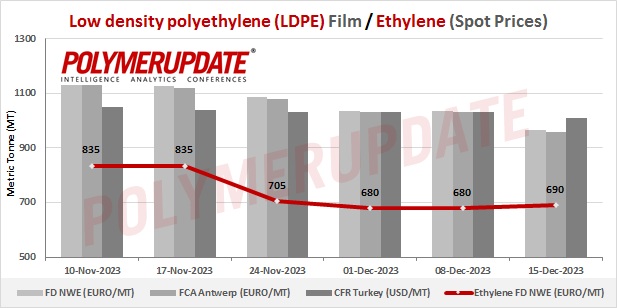 Feedstock ethylene contract price for December 2023 settled at the Euro 1185/MT FD North West Europe levels. This price represents a fall of Euro 30/MT from its November 2023 settlement levels.