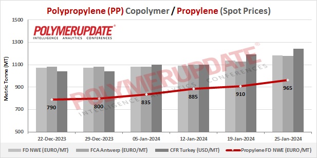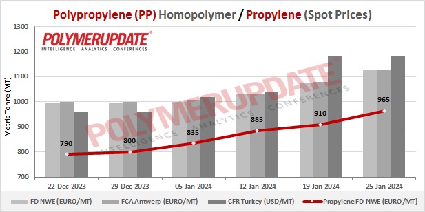FCA Antwerp PP homopolymer prices were assessed at the Euro 1100-1130/mt levels, sharply higher by Euro (+50/mt) week on week. FCA Antwerp PP copolymer prices were assessed at the Euro 1150-1180/mt levels, a week on week spike of Euro (+50/mt).