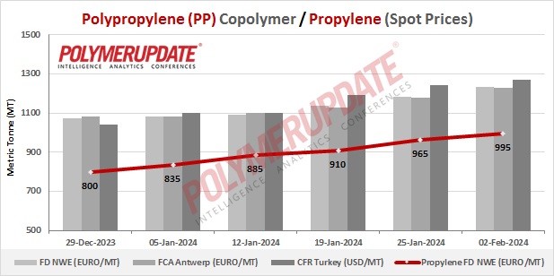 An industry source in Europe informed a Polymerupdate team member, “European PP prices trended higher in the week owing to a confluence of bullish factors including supply disruptions arising from the Red Sea crisis which has led to delayed arrival of import cargoes from the Middle East and Asia."