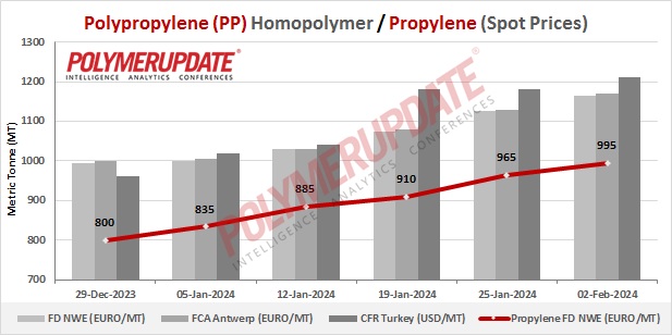 European propylene feedstock contract price for February 2024 settled at the Euro 1065/MT FD North West Europe levels. This price represents a gain of Euro 15/mt from its January 2024 settlement levels.