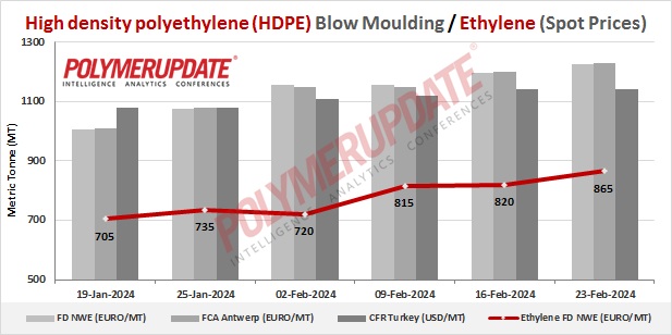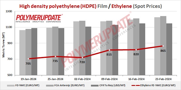 Ethylene spot prices on Thursday were assessed at the Euro 855-865/mt FD North West Europe levels, a steep rise of Euro (+45/mt) week on week.