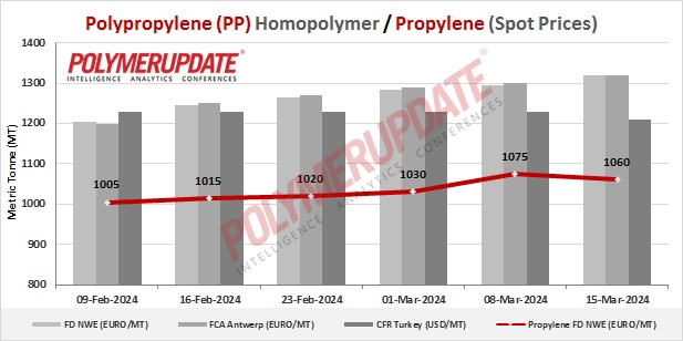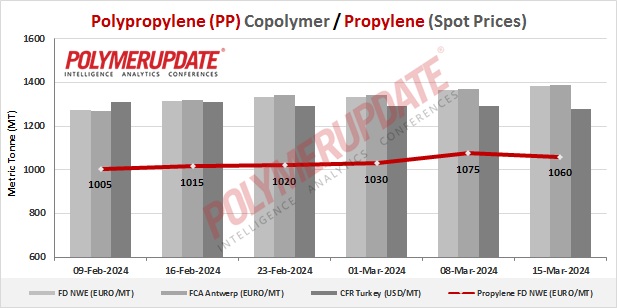 Upstream propylene spot prices on Thursday were assessed at the Euro 1050-1060/mt FD Northwest Europe levels, a week on week fall of Euro (-15/mt).