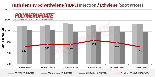 Ethylene spot prices on Thursday were assessed at the Euro 805-815/mt FD North West Europe levels, a steep week on week decline by Euro (-80/mt).