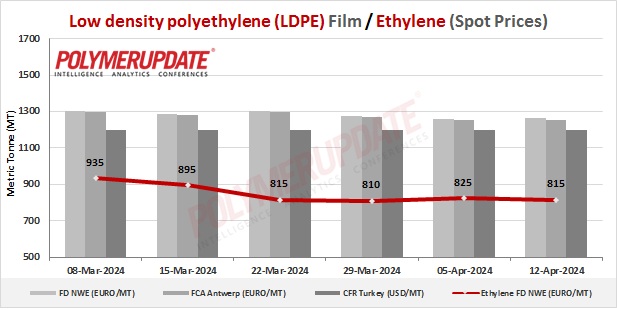 Ethylene spot prices on Thursday were assessed at the Euro 805-815/mt FD North West Europe levels, a week on week slip of Euro (-10/mt).