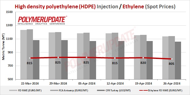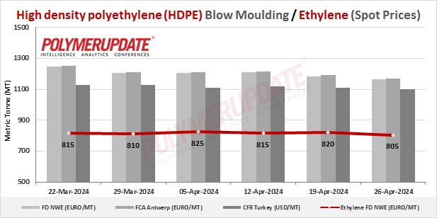 A European industry source while requesting to remain unidentified informed a Polymerupdate team member, “European HDPE spot prices experienced a downtrend on the back of a decline in demand and lack of pressure from cheaper US import material on offer. A shorter working month in Europe due to Easter holidays coupled with several public holidays in May is likely to further exert a bearish impact on demand from converters. Moreover, demand has also eroded as consumers have been struggling with limited disposable incomes.”