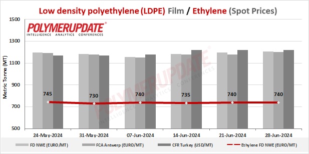 In the spot markets, LDPE prices were assessed at the Euro 1195-1205/mt FD Northwest Europe mark, week on week up Euro (+10/mt). An industry source in Europe informed a Polymerupdate team member, "In the European Low density polyethylene (LDPE) markets, participants were eagerly focused on the upcoming upstream ethylene contract price settlement in July. Naphtha changes towards the month-end elicited divergent opinions from market players with forecasts differing from a possible rise to a decline in prices.”