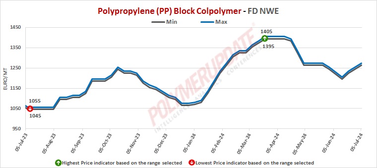 In the contract markets, PP block copolymer grade prices were assessed at the Euro 1570-1575/mt FD NWE Germany and FD NWE France levels, both left unchanged week on week. PP block copolymer grade prices were assessed at the Euro 1560-1565/mt FD NWE Italy levels, unchanged from the previous week. Meanwhile, PP block copolymer grade prices were assessed at the GBP 1330-1335/mt FD NWE UK levels, rolled over from last week.