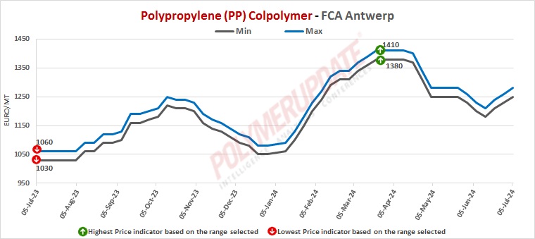 FCA Antwerp PP homopolymer prices were assessed at the Euro 1180-1210/mt level, stable week on week, while FCA Antwerp PP copolymer prices were assessed at the Euro 1250-1280/mt levels, both gaining by Euro (+20/mt) week on week.