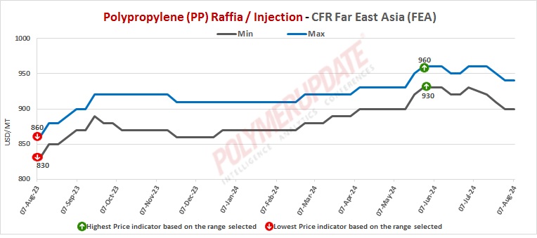 In India, Middle Eastern producers offered their PP raffia and Injection grades in the range of USD 990-1030/mt CFR levels, for shipment in August 2024.