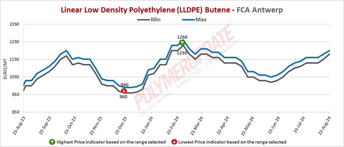 In the spot markets, LLDPE prices were assessed at the Euro 1195-1205/mt FD Northwest Europe levels, a sharp rise of Euro (+30/mt) from the previous week.