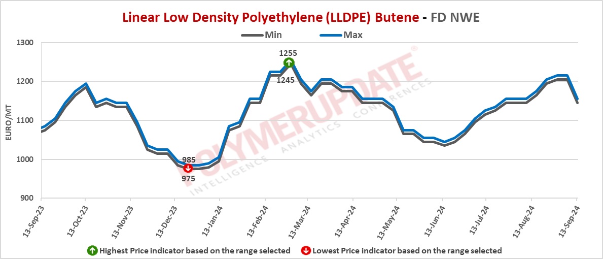 In the spot markets, LLDPE prices were assessed at the Euro 1145-1155/mt FD Northwest Europe levels, a tumble of Euro (-60/mt) from the previous week.