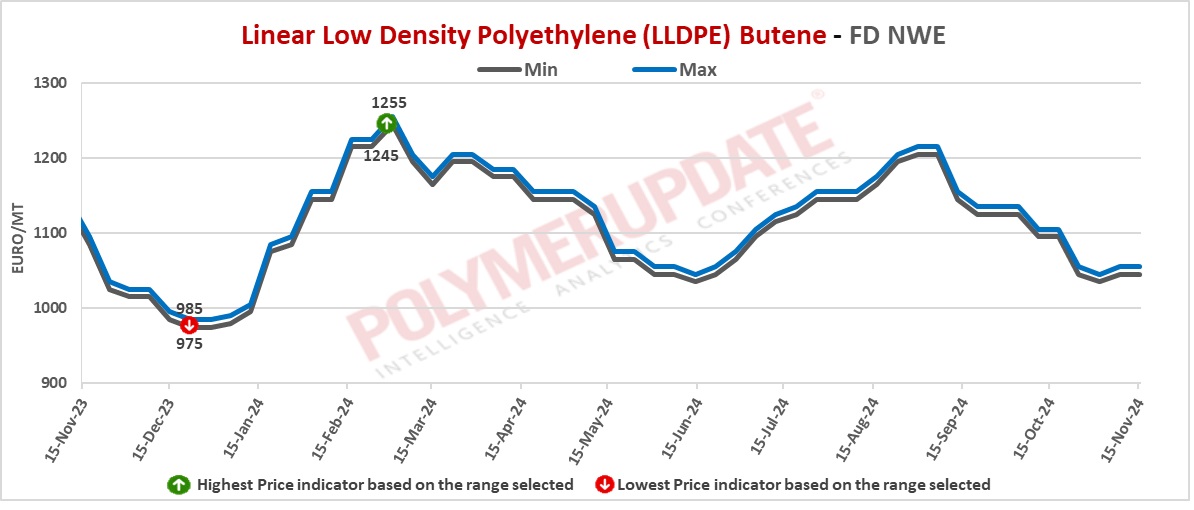 In the spot markets, LLDPE prices were assessed at the Euro 1035-1045/mt FD Northwest Europe levels, a fall of Euro (-10/mt) from the previous week.