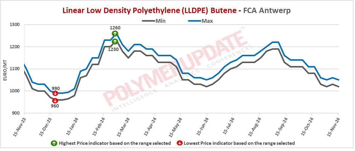 FCA Antwerp LLDPE film prices were assessed at the Euro 1020-1050/mt levels, down Euro (-10/mt) week on week.