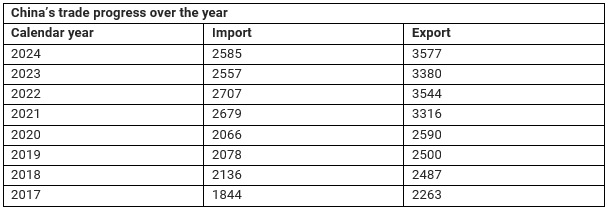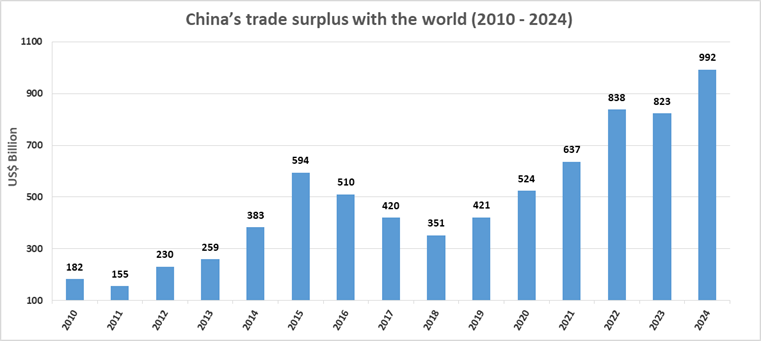 Just a week before U.S. President-elect Donald Trump assumes office, China surprised the world with a trade surplus of approximately US$ 1 trillion (US$ 992 billion, to be precise) in the calendar year 2024. This record trade surplus for the world’s second-largest economy comes at a time when other major economies continue to face challenges in sustaining trade and economic growth.