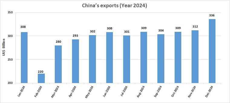 China’s trade surplus in 2024 is roughly equivalent to the entire U.S. trade deficit, estimated at approximately US$ 1 trillion for the year. In the Indian context, China’s trade surplus is nearly equal to India’s total trade volume, encompassing both exports and imports. Despite ongoing geopolitical conflicts, China’s export value rose almost every month in 2024, surpassing the highs of 2022 during the pandemic. While the Chinese economy faced domestic challenges, including a continuing housing crisis and weak consumption, robust external demand provided critical support to exports.
