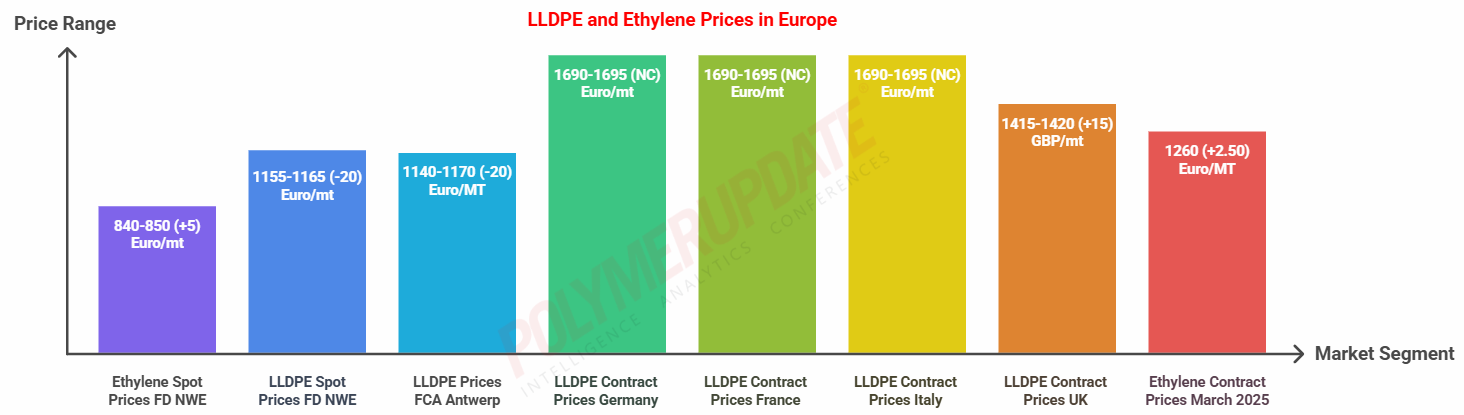 In the contract markets, LLDPE grade prices were assessed at the Euro 1690-1695/mt FD NWE Germany and FD NWE France levels, both unchanged week on week. LLDPE grade prices were assessed at the Euro 1690-1695/mt FD NWE Italy levels, stable from last week. Meanwhile, LLDPE grade prices were assessed at the GBP 1415-1420/mt FD NWE UK levels, a gain of GBP (+15/mt) from the previous week.