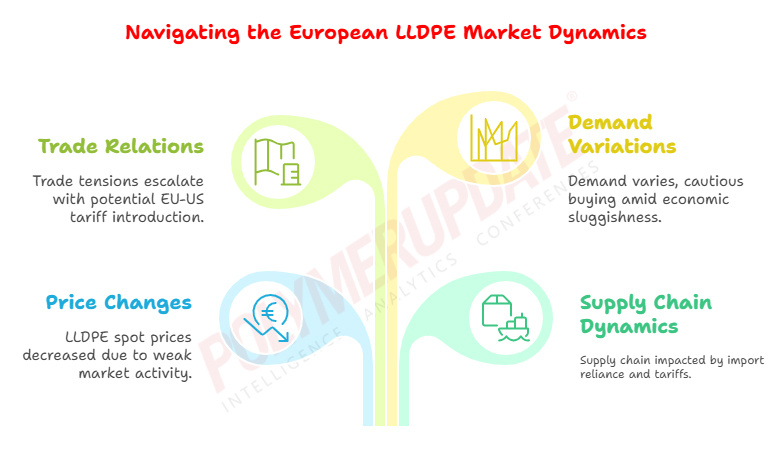 An industry source in Europe informed a Polymerupdate team member, "European LLDPE spot price has decreased due to a lack of robust market activity, while negotiations for April contracts remain uncertain. The supply of LLDPE in Europe is significantly reliant on imports, mainly from the United States. However, in the absence of clear information, buyers are expected to resist any price hikes. This week, stakeholders in the European polyethylene (PE) market adopted a cautious approach, given the unclear supply forecast for April and the second quarter. Central to the current scenario is the potential introduction of EU tariffs on LLDPE imports from the US. Ongoing discussions suggest that these tariffs may be implemented as early as April 13, with no indications of a reduction in trade tensions. Furthermore, the EU is contemplating broadening its proposed tariffs to encompass the US services sector in retaliation for the 25% tariffs imposed by the US on all automotive imports, indicating a possible escalation in trade conflicts in the near future.”