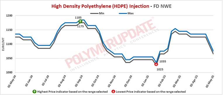 In the spot markets, HDPE film grade prices were assessed at the Euro 1095-1105/mt FD North West Europe levels, while HDPE BM grade prices were assessed at the Euro 1095-1105/mt FD North West Europe levels, both dropped by Euro (-20/mt) from the previous week. Meanwhile, HDPE injection grade prices were assessed at the Euro 1065-1075/mt FD North West Europe levels, a decline of Euro (-30/mt) from last week.