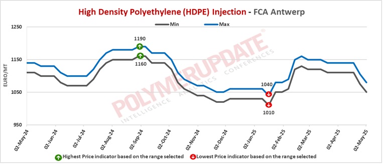 FC Antwerp HDPE film prices were assessed at the Euro 1080-1120/mt levels while FCA Antwerp HDPE BM prices were assessed at the Euro 1080-1120/mt levels, both falling by Euro (-15/mt) from the previous week. Meanwhile, HDPE injection prices were assessed at the Euro 1050-1080/mt levels, a decline of Euro (-25/mt) from week on week.