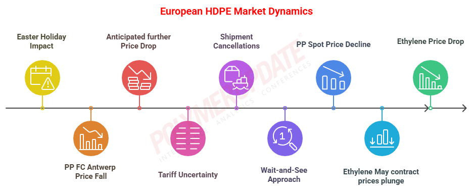 An industry source in Europe informed a Polymerupdate team member, "The European high-density polyethylene (HDPE) market has experienced a period of inactivity, largely due to a reduced working week in several countries following the Easter holiday and a backwardated pricing structure as May drew near. Most market participants have taken a cautious stance, opting to remain on the sidelines until the ethylene monthly contract price (MCP) for May was finalized, which was anticipated to show a significant decline compared to April. This expected reduction is attributed to lower upstream crude oil prices in April and a stronger euro against the US dollar, which has increased pressure on feedstock costs. Nevertheless, uncertainty surrounding tariffs on polyethylene imports from the United States has complicated the market dynamics, leading to differing pricing views among stakeholders. Although the European Commission postponed the proposed tariffs for 90 days on April 10, the timing during a short working month did little to alleviate pricing pressures or stimulate active discussions.”