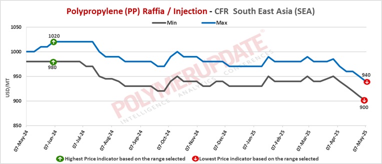 In Southeast Asia, overseas suppliers have offered their PP raffia and injection grades in the range of USD 900-940/mt, for shipment in May 2025.