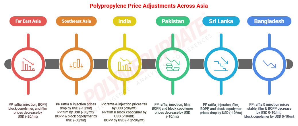 In Bangladesh, PP raffia and PP injection prices were assessed stable at the USD 950-980/mt CFR levels. PP film and BOPP prices were assessed at the USD 970-990/mt CFR levels, both week on week down USD (NC/-10/mt). PP block copolymer prices were assessed at the USD 1010-1050/mt CFR levels, a week on week fall of USD (NC/-10/mt).