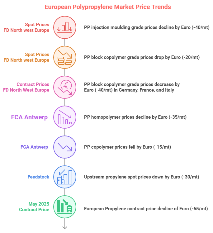 European Propylene contract price for May 2025 settled at the Euro 1015/MT FD North West Europe levels. This price represents a sharp decline of Euro 65/mt from its April 2025 settlement levels.