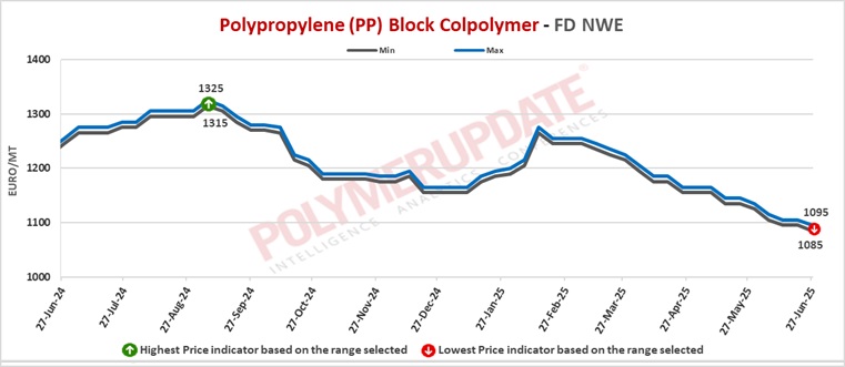 In the contract markets, PP block copolymer grade prices were assessed at the Euro 1470-1475/mt FD NWE Germany and FD NWE France levels, both decreased by Euro (-10/mt) from last week. PP block copolymer grade prices were assessed at the Euro 1460-1465/mt FD NWE Italy levels, a week on week decline by Euro (-10/mt). Meanwhile, PP block copolymer grade prices were assessed at the GBP 1255-1260/mt FD NWE UK levels, lower by GBP (-10/mt) from the previous week.