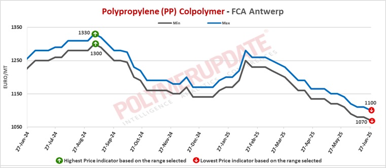 FCA Antwerp PP homopolymer prices were assessed at the Euro 970-1000/mt level while FCA Antwerp PP copolymer prices were assessed at the Euro 1070-1100/mt levels, both declining by Euro (-10/mt) week on week.