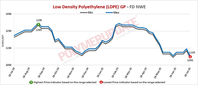 In the spot markets, LDPE prices were assessed at the Euro 1095-1105/mt FD Northwest Europe mark, a sharp week on week fall of Euro (-40/mt).