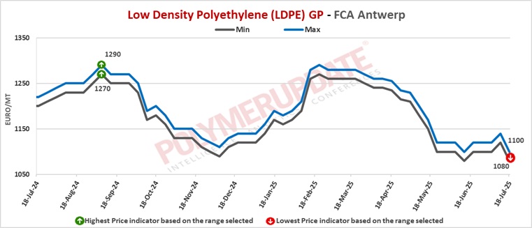 FCA Antwerp LDPE General Purpose film prices were assessed at the Euro 1080-1100/mt levels, a week on week tumble of Euro (-40/mt).