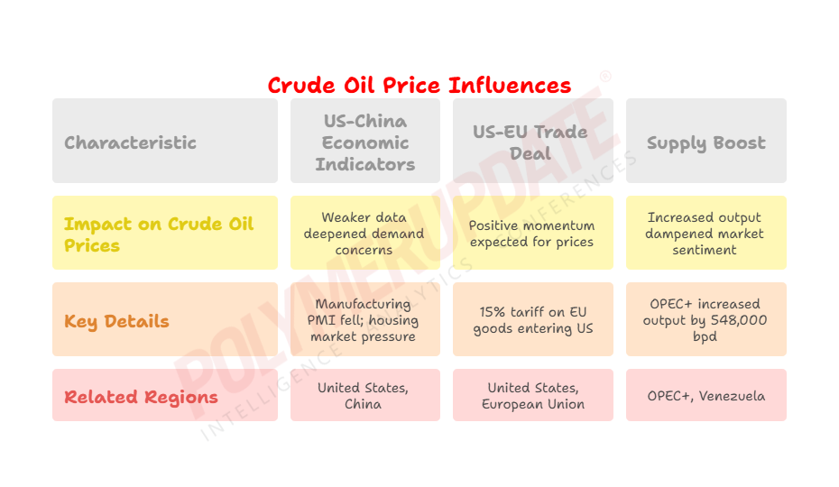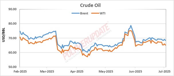 According to data compiled by Polymerupdate Research, benchmark Brent crude futures started the week steady, with the near-month delivery contract trading at US$ 69.21 a barrel on Monday, down from US$ 69.28 the previous day. However, profit-booking soon took hold, dragging Brent prices down to US$ 68.59 a barrel on Tuesday. After stabilizing at US$ 68.51 on Wednesday, the contract edged up to US$ 69.18 on Thursday before falling again on Friday to US$ 68.44 a barrel—the lowest level in July. Overall, Brent futures recorded a weekly decline of 1.21 percent, or US$ 0.84 a barrel.