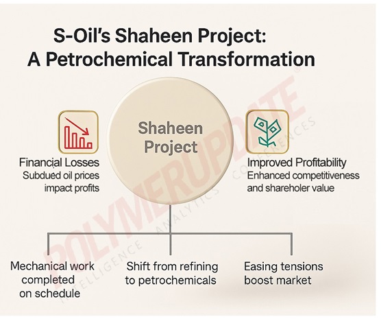 S-Oil's Shaheen Project, a major petrochemical complex in Ulsan, South Korea, is also progressing as planned and is expected to be completed in the first half of 2026. The project, involving an investment of Won 9.3 trillion, aims to enhance S-Oil's corporate value and strengthen South Korea's industrial competitiveness. Key facilities include a 1.8 million tonne/year mixed-feed cracking unit, an 880,000 tonne/year LLDPE unit, and a 440,000 tonne/year HDPE plant.