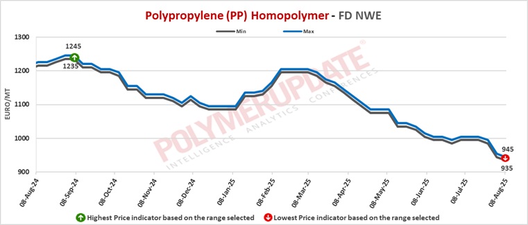 European propylene contract price for August 2025 settled at the Euro 1005/MT FD North West Europe levels. This price represents a fall of Euro (-10/mt) from its July 2025 settlement levels.