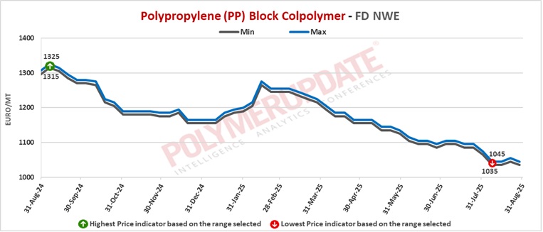 In the spot markets, PP injection moulding grade prices were assessed at the Euro 935-945/mt FD North West Europe mark while PP block copolymer grade prices were assessed at the Euro 1035-1045/mt FD Northwest Europe levels, both week on week down Euro (-10/mt).