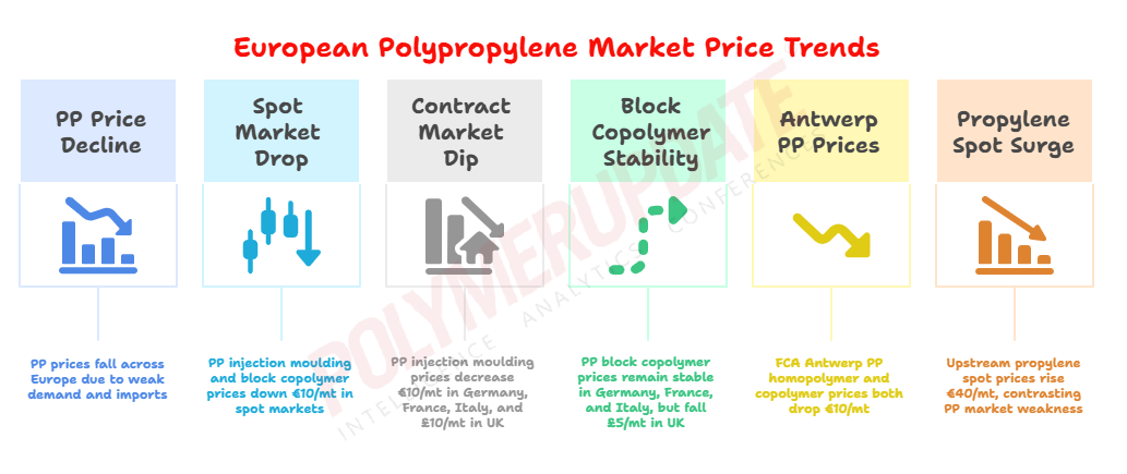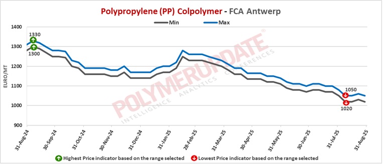 FCA Antwerp PP homopolymer prices were assessed at the Euro 920-960/mt level while FCA Antwerp PP copolymer prices were assessed at the Euro 1020-1050/mt levels, both lower by Euro (-10/mt) from the previous week.