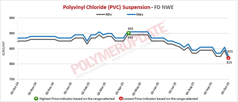 In the spot markets, FD North West Europe PVC prices were assessed at the Euro 815-825/mt levels, a week on week decline of Euro (-30/mt).