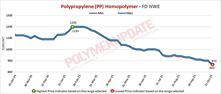 In the spot markets, PP injection molding grade prices were assessed at Euro 865-875/mt FD North West Europe while PP block copolymer grade prices were assessed at the Euro 965-975/mt FD Northwest Europe levels, both declined by Euro (-30/mt) from last week.
