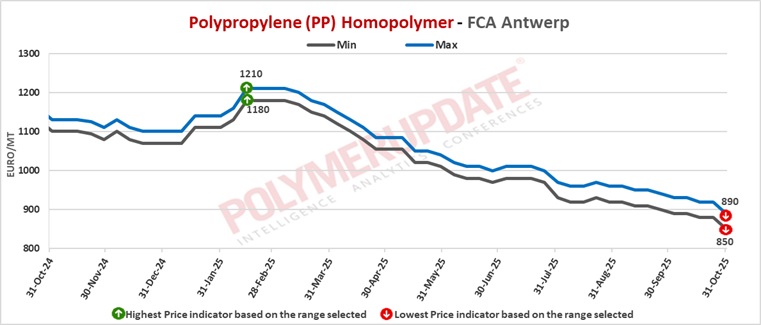 FCA Antwerp PP homopolymer prices were assessed at the Euro 850-890/mt levels while FCA Antwerp PP copolymer prices were assessed at the Euro 950-980/mt levels, both lower by Euro (-30/mt) from the previous week.
