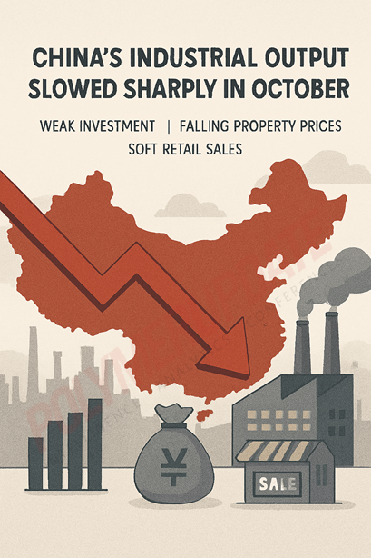 China’s industrial growth in October marked a slowdown from the 6.5 percent increase recorded in September 2025 and fell short of analysts’ expectations of 5.5 percent. Notably, the October 2025 performance was weaker than the 5.3 percent growth posted in the same month last year and represented the softest increase since August 2024. Although the Chinese government attempted to offset weak domestic consumption by ramping up exports, it failed to gain the expected traction amid global economic uncertainty triggered by geopolitical conflicts and U.S. tariff measures imposed on countries worldwide.