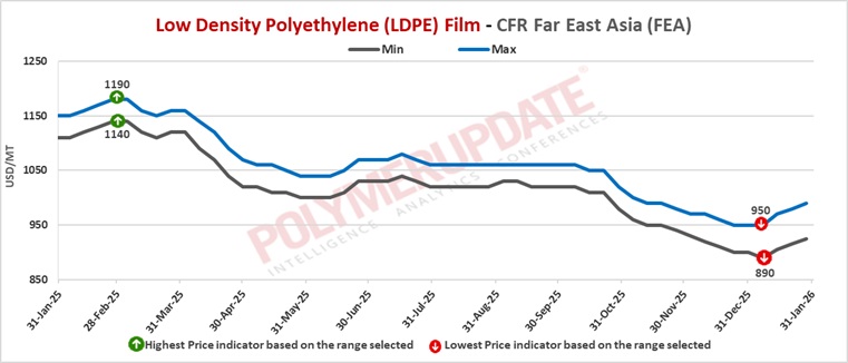 In Far East Asia, LDPE film grade prices were assessed at USD 925-990/mt CFR levels, a week-on-week increase of USD (+10/mt).