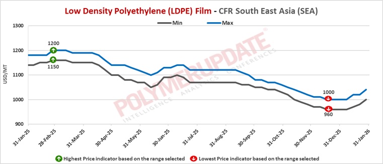 In South East Asia, LDPE film grade prices were assessed at USD 1000-1040/mt CFR levels, higher by USD (+20/mt) from the previous week.