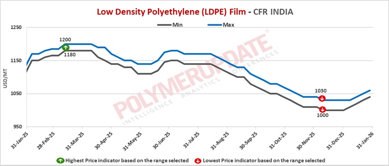 In India, LDPE prices were assessed at USD 1040-1060/mt CFR levels, up USD (+10/mt) from last week. Although import prices trended higher in the Indian market, weak downstream demand and rising cost pressures from the depreciation of the Indian rupee weighed on the market.