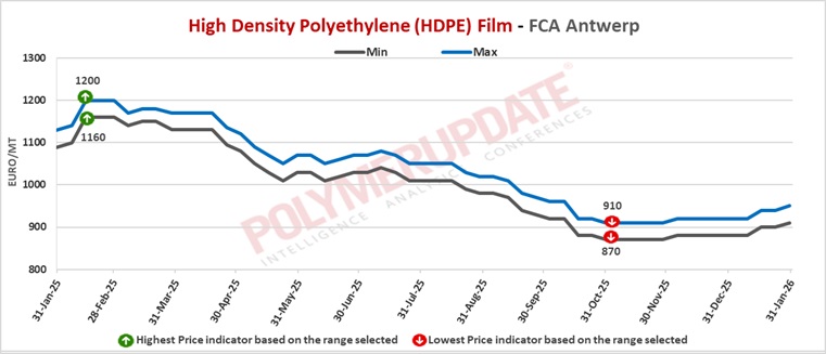 FCA Antwerp HDPE film prices were assessed at Euro 910-950/mt levels, while HDPE BM prices were assessed at Euro 910-940/mt levels, both increased by Euro (+10/mt) from last week. Meanwhile, FCA Antwerp HDPE injection prices were assessed at Euro 920-940/mt levels, up Euro (+10/mt)from the previous week.